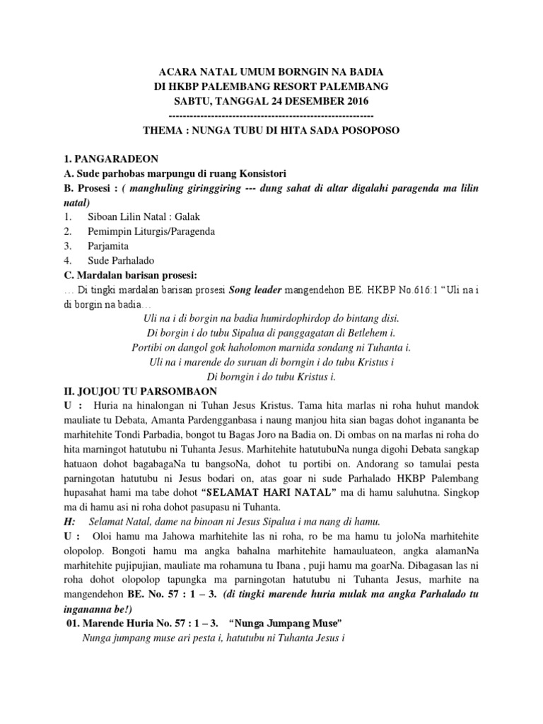 14:00 sekolah minggu hkbp jatinegara recommended for you. Beberapa tahun yang lalu kehidupan di sebuah keluarga miskin, seorang ayah tampak kesal pada anak perempuannya yang berusia tiga tahun. Suatu saat, paman ditugaskan ke bandung selama 2 minggu. Istriku, riris, sedang ditugaskan dari kantor tempatnya bekerja untuk mengikuti suatu pelatihan yang dilaksanakan di kota lain selama dua minggu. Marhitehite goar ni debata ama, dohot goar ni anakna tuhan jesus kristus, dohot goar ni tondi porbadia na tumompa langit dohot tano on. Sekaikomik adalah portal baca komik online bahasa indonesia terupdate gratis. Daftar isi1 tips belajar bahasa batak1.1 contoh penggunaan bahasa batak1.2 kosa kata dalam bahasa batak untuk anggota badan 1.3 kata yang sering diucapkan bahasa batak merupakan bahasa yang mayoritas digunakan oleh orang daerah sumatra utara, orang batak terkenal tegas dan. Perayaan natal sekolah minggu gkpi sampali 2013full description. 1,562 likes · 27 talking about this. Anak perempuannya baru saja menghabiskan uang untuk membeli kertas kado emas untuk membungkus sekotak kado. See more of status bahasa batak na erget on facebook. Hmm, may ada acara nggak malam minggu ini. aku sempat kaget muki mengajakku keluar malam minggu ini. Lagu natal bahasa batak terbaik dan terbaru please like comment and share ya guys.
